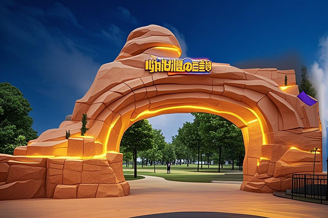主體完工后進入上色階段,以前的仿真古樹的主色調是黃色偏黑灰色,這種壓抑的色調對整個大門顯然不合適,于是用歡快的明黃做為主色調,在凹陷的部位用暗黃做調色,用這種方案上色的仿真樹大門顏色歡快,給人一種舒適的感覺。