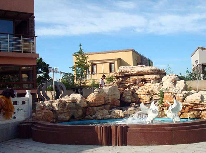 色多淡黃,質松,易琢,吸水性強,易長青苔,于植物生長有利。砂積石系泥沙與碳酸鈣凝聚而成,質地不太均勻,有松有緊,含泥沙多處松,含碳酸鈣多處堅。缺點是易損壞,冬季移至室內,免凍壞。常用于表現崇山峻嶺、山青水秀景色。