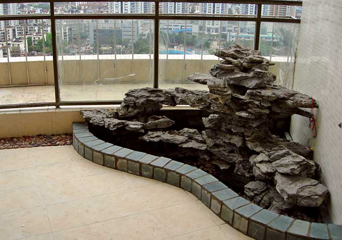項目描述:室內假山-所用石材產自易縣,石材呈深灰色,有很多層狀紋理。是沉積巖的一種,有深灰色、褐色和土黃色等色調,有的層中夾礫石。千層石形狀如國畫中的折帶效,質地極堅硬,體重,不吸水,可加工。用千層石造景,可橫層劈截或粘接組合。